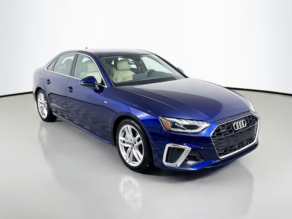 Certified. 2023 Audi A4 Navarra Blue Metallic 45 S line Premium Plus Certified, Call now, Local Trade, 7-Speed Automatic S tronic, quattro, Beige Leather, 2 Rear USB Charge Ports, Adaptive Cruise Control, Alarm System w/Motion Sensor, Audi Active Lane Assist, Audi Advanced Key, Audi Connect PLUS, Audi Phone Box, Audi Side Assist w/Pre Sense Rear, Audi Virtual Cockpit Plus, Auto-Dimming Exterior Mirrors w/Memory, Bang & Olufsen Sound System w/3D Sound, Convenience Package, Hands-On Detection Steering Wheel, Heated Steering Wheel, Leatherette Covered Center Console & Door Armrests, Memory for Driver's Seat, MMI Navigation Plus, Navigation Package, Parking System Plus, Power Folding Exterior Mirrors, Premium Plus Package, SiriusXM w/360L, Top View Camera System, Traffic Jam Assist. Clean CARFAX. CARFAX One-Owner. quattro 7-Speed Automatic S tronic 2.0L TFSI