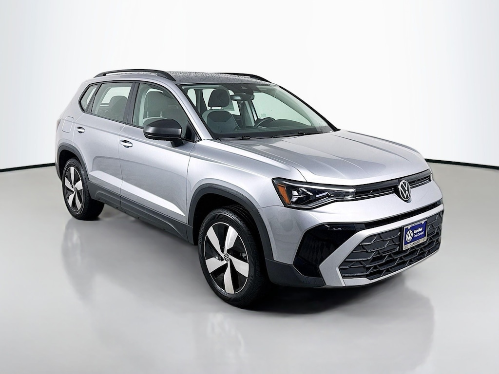 Certified. 2025 Volkswagen Taos Pyrite Silver Metallic/SSM 1.5T S Certified, Like new, Save money, Call now. Clean CARFAX. CARFAX One-Owner. AWD 8-Speed Automatic with Tiptronic 1.5L I4 Turbocharged DOHC 16V LEV3-SULEV30 174hp